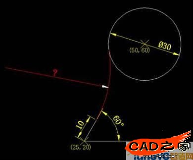下面我們來看一道例題,通過這道例題來熟練掌握中望 CAD 2009在三點(diǎn)畫圓法中的垂點(diǎn)應(yīng)用。例題為:根據(jù)已知條件求紅色圓弧的半徑。