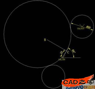 首先分析這道題目,由題目得知所求圓弧要與線段和已知圓同時(shí)相切。所以比較容易想到的是用中望CAD2009的相切、相切、相切畫圓法。但是只有兩個(gè)與其相切的對(duì)象。再仔細(xì)一看“且過線段10上方的端點(diǎn)”,說明所求圓弧與線段的切點(diǎn)正是這個(gè)上方的端點(diǎn),進(jìn)而得知所求圓弧的圓心肯定在與線段10垂直且過上方端點(diǎn)的垂線上,于是可以做垂線BC。那么以BC為鏡像線來鏡像已知圓就得到了第三個(gè)相切目標(biāo),此時(shí),就可以很自然的用相切、相切、相切畫圓法了。如圖: