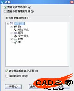 技巧一:PURGE命令。這可能是大家最了解的一個“瘦身”方法。采用中望CAD 2009中的PURGE命令可以把圖形中沒有使用過的塊、圖層、線型等全部刪除,可以達到減小文件的目的。