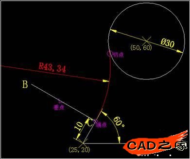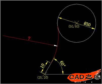 下面我們來看一道例題,通過這道例題來熟練掌握中望 CAD 2009在三點畫圓法中的垂點應用。例題為:根據(jù)已知條件求紅色圓弧的半徑。