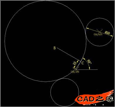 首先分析這道題目,由題目得知所求圓弧要與線段和已知圓同時相切。所以比較容易想到的是用中望CAD2009的相切、相切、相切畫圓法。但是只有兩個與其相切的對象。再仔細一看“且過線段10上方的端點”,說明所求圓弧與線段的切點正是這個上方的端點,進而得知所求圓弧的圓心肯定在與線段10垂直且過上方端點的垂線上,于是可以做垂線BC。那么以BC為鏡像線來鏡像已知圓就得到了第三個相切目標,此時,就可以很自然的用相切、相切、相切畫圓法了。如圖: