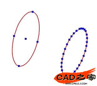 Pellipse :這個變量可以控制畫出來的橢圓,其屬性是橢圓還是多段線。當這個變量值為on時,畫出來的橢圓是一個多段線對象;當值為off時,則畫出來的橢圓是真正的橢圓對象。具體是橢圓對象還是多段線對象呢?具體我們可以選中后,查看屬性欄。這兩種對象在選中后的效果也是不一樣的,多段線表示的橢圓具有相當多的夾點,更加方便編輯。如下圖,左邊的橢圓是橢圓對象,右邊的是多段線對象。很明顯夾點數是不一樣的。