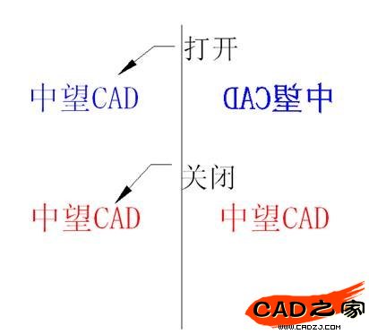 Mirrtext :這個變量控制在對文字進行鏡象時,文字的方向是保持不變還是鏡象文字。當這個變量打開時,以鏡象的方式顯示文字;而當這個變量關閉時,則文字方向保持不變。從下圖我們可以看到具體這個變量在打開和關閉時的文字鏡象效果。