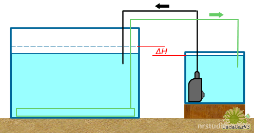 主缸布置DIY底濾,小缸用于進一步過濾,相當于測濾+外濾。為避免振動等對主缸生物的影響,水泵置于濾缸,用以制造水位差 ΔH 而形成虹吸,使主缸被動出水。