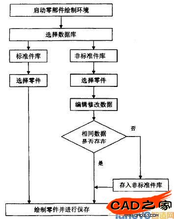 系統可以分為兩個流程,一個是零件繪制流程,另一個是裝配流程。這兩個流程相互配合,缺一不可。裝配流程圖如圖1,零件繪制流程圖如圖2。