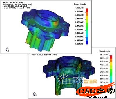 該實例為TrueGrid與顯式求解器LS-DYNA相結合分析車輛后輪轂在復雜歷程沖擊載荷下的應力分布狀況。車輛后輪轂是影響車輛安全運行的重要零件,如圖3所示,因此利用CAE軟件對其進行全面分析十分必要,但由于后輪轂具有外形復雜,包含通孔、沉孔等細部結構,因此傳統方法是對它進行四面體網格劃分,這樣在相同的計算成本下,結果的精確就會受到影響。