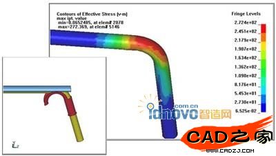 以圓管90°模具繞彎加工為例,在TrueGrid中建立幾何以及網格模型,定義剛體模具材料屬性以及變形彎管的材料屬性,定義part間的運動關系以及邊界條件。此網格模型包含了4個part,3600個變形體殼單元以及680個剛體殼單元。TrueGrid前處理完畢后即生成K文件,通過運行LS-DYNA求解器,調用K文件即可對該模型進行求解計算。圖9中顯示了該模型的計算結果。