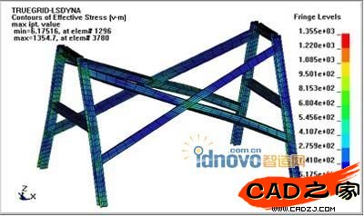 利用TrueGrid就可以快捷地對復雜結構的桿結構件進行規則的四邊形網格劃分,并進行材料參數設置、邊界條件設定等工作,生成計算模型。導入LS-DYNA后,利用面內單點積分進行計算,結果如圖13所示。