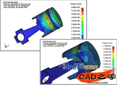 利用TrueGrid可以快捷地對結構異常復雜的活塞聯桿機構進行規則的六面體網格劃分(圖 18)。圖示模型包含了24個圓柱和平面,網格分成9個部件,共生成7,488個節點、271個殼單元和3,560個實體單元。此外,TrueGrid提供的密度參數化控制功能,通過直接調整參數值,就可以一步到位地調整模型尺寸或網格疏密,大大提高了工作效率。圖18是活塞聯桿機構的粗網格模型,通過切換參數,就可以迅速生成圖19和圖20所示的中等密度網格和較密網格模型。在TrueGrid中完成LS-DYNA前處理設定,包括part定義,材料參數設置,邊界條件設定等工作,生成完整的計算模型。該模型在顯式求解器LS-DYNA中的計算結果如圖21-22所示。