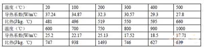 計算用鋼種的材料密度為:7840kg/m3;材料的導熱系數及比熱見表1。