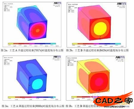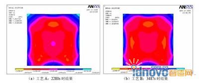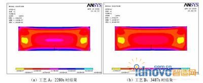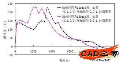 在加熱初始階段(300s 左右),兩種工藝的心部角部溫度差很接近;在3200s 前,工藝A(加熱時間為150min)心部角部溫度差高于工藝B(加熱時間為180min)。而在3200s 后,工藝A(加熱時間為150min)心部角部溫度差基本低于工藝B(加熱時間為180min)。