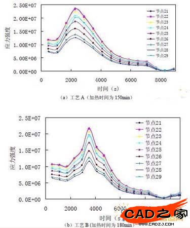 圖 11 為x=0.1 線上節點的應力強度隨時間變化的歷程曲線,計算結果表明,在整個時間歷程中,節點21(中心軸上節點)(見圖9a)的應力強度最大,隨y 坐標的增大,節點的應力強度降低,在接近表面處,應力強度增加。對于工藝A,節點應力強度在2280s 左右(預熱段)出現最大值;對于工藝B,節點應力強度在3487s(加2 段)左右出現最大值。隨后各點的應力強度隨時間增加降低,且各點的應力強度逐漸趨于一致。 根據前面的分析結果,對工藝A(加熱時間為150min)在2280s 時位于xy 中間面x=0.2 上各節點的應力強度和工藝B(加熱時間為180min)在3487s 時相應位置上各節點的應力強度進行比較(圖12)。結果表明工藝經修改后,應力強度降低。并根據公式