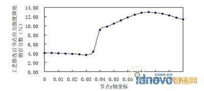 圖 13.工藝修改后節點(位于xy 中間面x=0.2 線上)應力強度降低的百分數