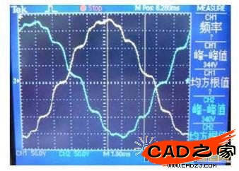在空載試驗(yàn)中用原動機(jī)將樣機(jī)拖動到額定轉(zhuǎn)速,用示波器檢測相反電勢波形,圖14為試驗(yàn)機(jī)組,圖15 為示波器實(shí)測的額定轉(zhuǎn)速時空載工況第一和第四相繞組相反電勢波形。