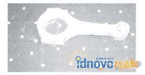 作者采用的實物模型是汽車連桿,如圖2所示。由于連桿自身尺寸較小,而且表面特征區(qū)域較多,所以可以貼標記點的部分有限,無法通過在零件自身貼標記點的方式獲得點云數(shù)據(jù)。在該實例中,可以通過增加一塊輔助板來進行測量。此輔助板是一塊平面板,在輔助板面上按照貼標記點的規(guī)則均勻貼滿標記點,而連桿本身可以不貼標記點,通過輔助板上的定位點可以完成對于類似汽車連桿等小零件的測量。圖3是著色后的連桿放在貼滿標記點的輔助板之上。