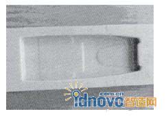 對仿真結果滿意后,通過通信接口將數控程序輸入機床控制系統,完成模具型面的實際加工。先將模具原型縮小十倍采用尼龍材料加工,之后再用模具材質進行實物加工。凸模模型粗加工結果如圖5所示。粗加工結束后再調入精加工程序,由于機床內存相對較小,把精加工程序分為三段輸入。每一段的起刀位置必須是上一段的終點,并增加空走部分程序。凹模模型精加工結果如圖6所示。