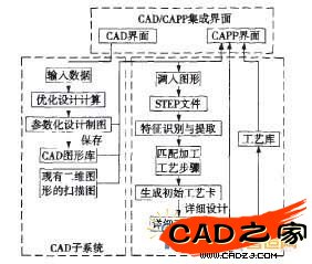 筆者設計了一種CAD/CAPP集成的方案,本集成系統由CAD特征建模子系統和CAPP子系統兩大部分組成,如圖1所示,本系統實現了CAD/CAPP之間很好的銜接,能夠實現結構參數優化設計、產品造型和工程圖的自動繪制和工藝的自動生成。