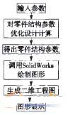 工作過程為:輸入相關參數,然后經過最優化設計計算得到軸的最優結構參數,然后把這些參數輸入由VC++制作的輸入界面,點擊“確定”按鈕,那么此VC++就可調用SolidWorks繪制所需要的三維圖形,然后由這些單位圖形轉化為二維工程圖。本CAD子系統優化設計的流程見圖3所示。