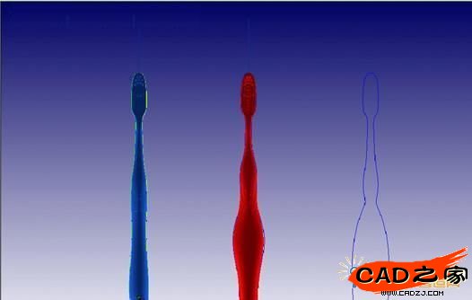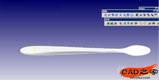 3自此我們的空間曲線已經做好,然后就要生成牙刷的曲面,在這里我要向推薦styling的“放樣’命令,這個命令是我們曲面使用頻率非常高的,操作簡單。生成的曲面的非常光滑。如圖21牙刷手柄曲面