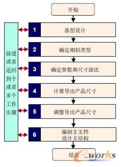 系列產品是具有相同的功能、工作原理和盡可能相同的制造方法的產品集合;它們具有多種參數和性能指標,以滿足不同用戶的需要,這些參數和性能指標間具有一定的公比級差。系列產品的開發步驟首先是確定基本型,然后確定相似類型、參數和尺寸級比,計算導出產品尺寸,最后調整尺寸,形成產品的主結構和各種主文檔。參見圖3: