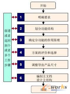 組合產品中的結構塊被劃分成不同的參數等級,因而其結構塊也是產品系列。組合產品的開發步驟首先是明確要求、劃分功能結構,然后確定分功能的作用原理、選擇方案和評價,最后計算導出產品尺寸,調整尺寸,形成產品的主結構和各種主文檔。參見圖4:
