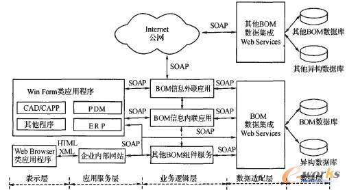 c)BOM信息內聯應用:負責與企業內部BOM數據集成Web Services進行交互,同時實現系統的內部應用邏輯。