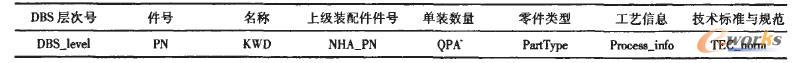橫向來看,EBOM中,各零部件包含了設計、制造所需的諸多信息,可分為3類:標識類、裝配關系描述類和零部件自然屬性類。標識類有件號、名稱;裝配關系描述類包括產品圖樣及文件編號系統(DBS)層次號、上級裝配件件號、對稱性說明、單裝數量;零部件自然屬性包括零件類型(如裝配件、機加件、鍛件、鑄件、鈑金件、膠接件、焊接件、標準件、成品件等)、材料、質量、表面處理、熱處理、加工與裝配工藝信息(如化銑、噴丸成形、噴丸強化、膠接、蜂窩夾層、焊接等)i零件制造所需的技術標準與規范等。