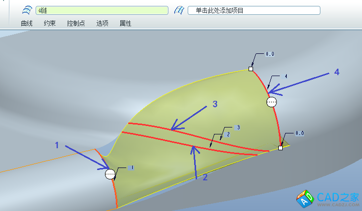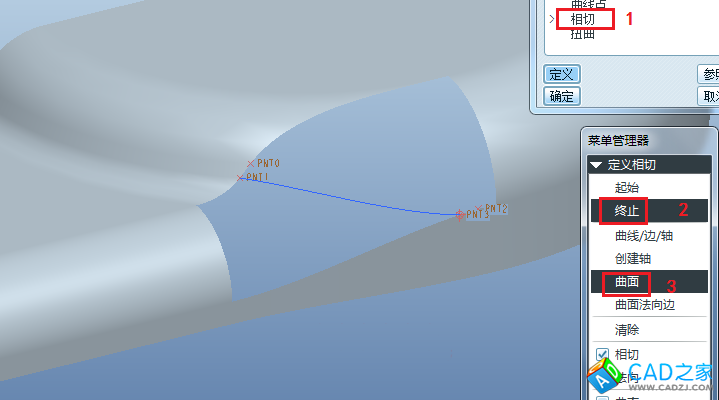 雙擊【相切】,分別設置曲線的起始和終止處與曲面相切,如下圖。