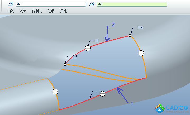 激活第二方向,選擇下圖編號為1所示的邊,再按住Ctrl選擇編號為2的邊。由于編號為2的邊由多段曲線組成,我們需要按住shift鍵進行選取。