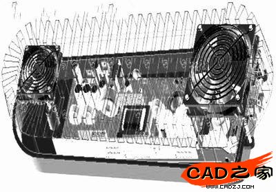 該型號是一高功率電源,主要部件由面殼散熱器,底殼,2個風扇組件,一個PCB組件以及一個電源插座構(gòu)成。如圖1所示。風扇組件及PCB組件含有不同的零件組成。裝配關(guān)系是風扇組件裝在面殼散熱器上,PCB組件及電源插座裝在底殼中,底殼最終固定在面殼上。各組件都是通過螺釘連接固定。