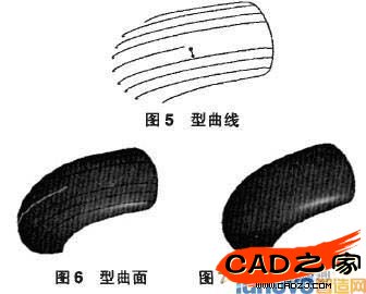光順調(diào)整后的型曲線是生成曲面的主要依據(jù)。首先判斷需要生成何種曲面,然后利用Pro/E系統(tǒng)強大的曲面造型功能來構(gòu)建自由曲面。選擇菜單命令[特征]。[創(chuàng)建][曲面][新建][高級]、[邊界混合],按順序選擇截面曲線作為邊界線,最后需檢查曲面的光順性及與其他曲面的連續(xù)性。當(dāng)曲面曲率變化比較均勻時,即達到設(shè)計要求。若曲面質(zhì)量很差,需對不合理的曲面進行修改,直至曲面讓人滿意為止。圖5是在Pro/Scantools環(huán)境下創(chuàng)建的型曲線,以此為特征線并運用Pro/E的造型功能生成的曲面如圖6所示。點擊菜單欄[編輯]/[實體化](或加厚)命令,選擇或輸入相應(yīng)的選項或參數(shù),即可使曲面轉(zhuǎn)化為實體如圖7所示。最后在生成的3D模型實體的基礎(chǔ)上進行倒角優(yōu)化或者改進設(shè)計,直至滿足設(shè)計要求。