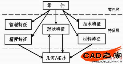 (5) 管理特征。用于描述零件的管理特征,如零件名稱、設計者、設計日期、數量、圖號、版本等信息。零件的幾何/拓撲信息是基礎。特征層是核心,特征層中各種特征子模型之間的相互聯系反映了特征間的語義關系,使特征成為構造零件的基本單元具有高層次的工程含義,從而支持CAPP、NC編程,加工仿真對零件數據的需求。