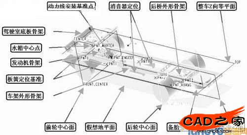 根據各總成間的構建情況,設定傳遞接點和要素,用以控制設計意圖在各系統間的傳遞,同時為骨架傳遞確定初步要素。同時建立整車基準坐標系和各總成坐標系,各總成坐標系與整車坐標系可無關聯聯系。如圖2所示。