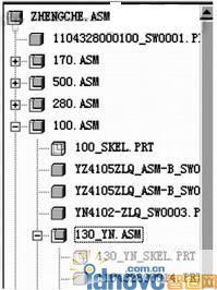 在總布置的骨架中需有動力總成的定位參數和與前后懸置的安裝點,在以后的設計中動力總成的位置可以靠改這些參數來實現。動力總成分組做的動力總成骨架需要與總布置中的動力總成的參數一樣。在動力分組在以后的設計中,只能在動力總成骨架中修改骨架和增加中一些參數,不能刪除初定的參數,否則就會造成總布置再生的失敗。在動力總成中進一步創建本體、進氣系統、排氣系統、供油系統及冷卻系統、離合器、子總成;在這些子總成里面首先創建這相子總成的骨架零件。然后根據骨架創建各子總成的零件,或將零件安裝在骨架上。當其中一零件需要其他零件的面做參考時,盡量不從同一級關系的零件中去取參考,從此一級零件的骨架上或上一級的零部件上去取參考,如傳動軸的中間支撐由車架提供安裝點,在傳動軸的骨架中,萬向節一定要建立為十字軸的骨架,同時為了以后的可調性和傳動軸隨動性,每一個傳動軸采用兩段,由中間軸線和與通過與十字軸連接的孔中心線與傳動軸骨架裝配。