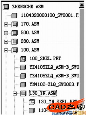 在總布置的骨架中需有動力總成的定位參數和與前后發動機懸置的安裝點,在以后的設計中動力總成的位置可以靠改這些參數來實現。動力總成分組做的動力總成骨架需要與總布置中的動力總成的參數一樣。在動力分組在以后的設計中,只能在動力總成骨架中修改骨架和增加中一些參數,不能刪除初定的參數,否則就會造成總布置再生的失敗。在動力總成中進一步創建發動機本體、進氣系統、排氣系統、供油系統及冷卻系統、離合器、變速器子總成;在這些子總成里面首先創建這相子總成的骨架零件。然后根據骨架創建各子總成的零件,或將零件安裝在骨架上。當其中一零件需要其他零件的面做參考時,盡量不從同一級關系的零件中去取參考,從此一級零件的骨架上或上一級的零部件上去取參考,如傳動軸的中間支撐由車架提供安裝點,在傳動軸的骨架中,萬向節一定要建立為十字軸的骨架,同時為了以后的可調性和傳動軸隨動性,每一個傳動軸采用兩段,由中間軸線和與通過與十字軸連接的孔中心線與傳動軸骨架裝配。