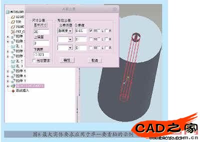 如圖8所示為最大實(shí)體要求應(yīng)用于單一要素軸的情況,¢2000-0.021mm軸的軸線(xiàn)直線(xiàn)度公差與尺寸公差的關(guān)系采用最大實(shí)體要求。軸線(xiàn)直線(xiàn)度誤差允許范圍:0.01~0.031。當(dāng)軸處于最大實(shí)體狀態(tài),即軸的實(shí)際尺寸處處皆為最大實(shí)體尺寸20mm時(shí),軸線(xiàn)直線(xiàn)度誤差允許值為0.01mm;當(dāng)軸處于最小實(shí)體狀態(tài)即軸的實(shí)際尺寸處處皆為最小實(shí)體尺寸19.979mm時(shí),軸線(xiàn)直線(xiàn)度誤差允許增大到0.031mm。將直線(xiàn)度公差帶變動(dòng)范圍的數(shù)值擴(kuò)大100倍后顯示的效果,如圖9所示,分別為1.00和3.10,兩圓柱之間的區(qū)域就是直線(xiàn)度誤差允許的范圍。通過(guò)分析研究位置公差中的定向公差、定位公差和尺寸公差之間的關(guān)系,確定檢驗(yàn)的優(yōu)先級(jí)別為:尺寸公差最高,定位公差次之,定向公差最低。也就是說(shuō),當(dāng)同時(shí)加載多種公差,隨機(jī)生成帶公差尺寸值時(shí),必須再次檢驗(yàn)高級(jí)別的公差是否滿(mǎn)足。