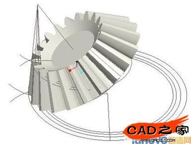 運用混合命令首先建立一個齒,再運用復制和陣列的方法,建立所有的輪齒特征;最后運用旋轉工具建立齒輪的基體,這樣直齒圓錐齒輪的主體部分就建立完成。如圖5所示,建立新圖層curve將所有的輔助線條納入其中,并將該層隱藏,得到如圖6顯示的模型。