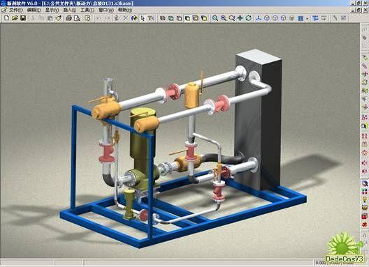Solid3000軟件在裝配設計環境下可新建零件或新建子部件,然后在裝配環境中編輯這些新產生的零件及子部件。在這個設計產品中,所有管類零件、部分變徑及一個子裝零件底座均為自頂向下設計方式在裝配中設計的。比如下圖所示的管件,我們先確定零件在裝配中的位置為直接連接在焊接球閥上,而且管徑和焊接球閥的安裝直徑一致。那么,在實際設計過程中,我們就可以映射焊接球閥的實體邊為管件的草圖,確定管徑,通過拉伸的方式就可得到實際需要的零件。而這個零件和焊接球閥又存在著關聯關系,當我們改變球閥后,管件也可以自動更新。那么當我們需要另一個系列尺寸的這個產品時,我們只需要改變關鍵零件(換熱板和水泵)的尺寸,然后通過標準件替換功能,更換相匹配的各種自定義的閥類標準件,從而驅動相連的管件和安裝支架。這樣就可以非常方便的獲得一個不同系列的產品。