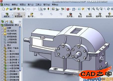 虛擬設(shè)計(Virtual Design)是將VR技術(shù)和CAD技術(shù)相結(jié)合的一個應(yīng)用于多領(lǐng)域的新技術(shù)。近年來,商業(yè)CAD軟件及工具的興起,例如:PTC公司的產(chǎn)品SolidWorks,Pro/Engineer,SDRC的產(chǎn)品I-DEAS Master Series、UGS公司的產(chǎn)品Unigraphics等,推動了虛擬設(shè)計的發(fā)展。本文基于SolidWorks三維軟件完成的雙級減速箱的虛擬設(shè)計。