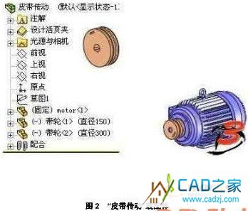 打開裝配體文件,如圖2所示,裝配體中已經插入了所需的零部件,針對兩個皮帶輪建立了配合關系,確定了皮帶輪的位置。