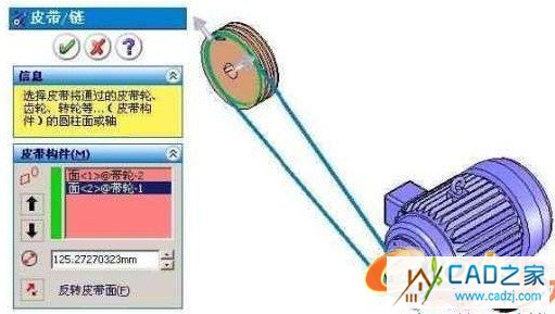 選擇下拉菜單的【插入】-【裝配體特征】-【皮帶/鏈】命令,或單擊“裝配體”工具欄中的【皮帶/鏈】按鈕,如圖3所示。