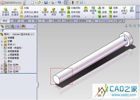 4)除了尺寸可以配置外,特征也可以配置,在特征樹中壓縮“拉伸-切除1”,則此配置中放置開口銷的小孔被壓縮。如圖6