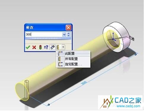 3)編輯尺寸,使長度為300,右下角選擇“此配置”,這個尺寸更改只影響當前配置,這一點很重要。修改之后有可能需要重建模型,單擊紅綠燈標志 或按Ctrl+B。如圖4