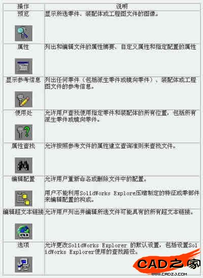 表1列出了SolidWorks Explorer提供了的幾種功能,可以通過操作窗口中工具按鈕或通過【工具】下拉菜單來執行。
