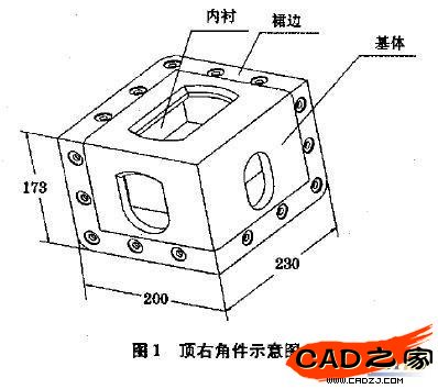 如圖1所示,角件的結構由內襯、裙邊和基體三部分組成,角件外形尺寸國軍標中并未嚴格限定,僅對開孔的形位尺寸作了規定。角件各部位厚度的不同影響著角件質量,在這三個部分中,基體部分是主要受力要素,其厚度應適當,其余部分起連接和密封作用,其厚度只需要滿足連接強度即可。
