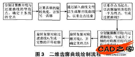 為形成精確的斷廓,采用插人足夠多的型值點(diǎn),再用樣條曲線擬合的方法形成齒廓曲線,為保證"拉伸切除"的順利實(shí)現(xiàn),必須形成完全封閉的齒廓曲線,因此要保證侮段弧線之間的連線點(diǎn)完全重合。繪制流程如圖3所示。