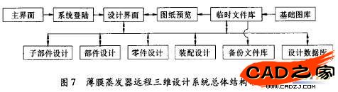 薄膜蒸發(fā)器遠程三維設(shè)計系統(tǒng)的目標(biāo)是:實現(xiàn)基于B/S模式的跨平臺的薄膜蒸發(fā)器遠程三維設(shè)計。包括零部件和裝配圖的三維造型設(shè)計,虛擬裝配設(shè)計以及設(shè)計結(jié)果的預(yù)覽、修改和下載。為此確立了如圖7所示的系統(tǒng)總體結(jié)構(gòu)。
