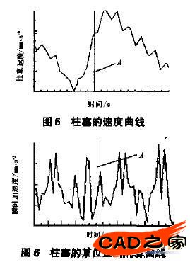圖3中A線表示的是軸向柱塞泵的柱塞運動軌跡線,圖4、圖5和圖6分別表示柱塞每一時刻的平均加速度,柱塞平均速度和柱塞上某一位置的瞬時加速度,移動以上3個圖中的A線,就可以觀察柱塞在該時刻A線所處位置的速度和加速度數(shù)值。