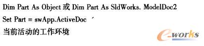 其次,要調(diào)用SolidWorks活動文檔對象。SolidWorks活動文檔對象,指的是"零件環(huán)境"、"裝配環(huán)境"、"工程圖環(huán)境"及"非工作環(huán)境"四個狀態(tài),它僅處于SolidWorks應(yīng)用程序?qū)ο笙?,要調(diào)用SolidWorks API的功能必須在調(diào)用SolidWorks應(yīng)用程序?qū)ο蠛笳{(diào)用此對象。用VB語言調(diào)用時代碼描述通常為: