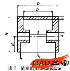 零件的實體建模,要求對實體進行系列化的參數化設計。根據實體的外形尺寸來選擇適當的參數變量作為主要參數。如圖2所示筒形活塞的基本參數為:活塞直徑D、活塞銷外徑d、連桿寬度B等基本參數確定。